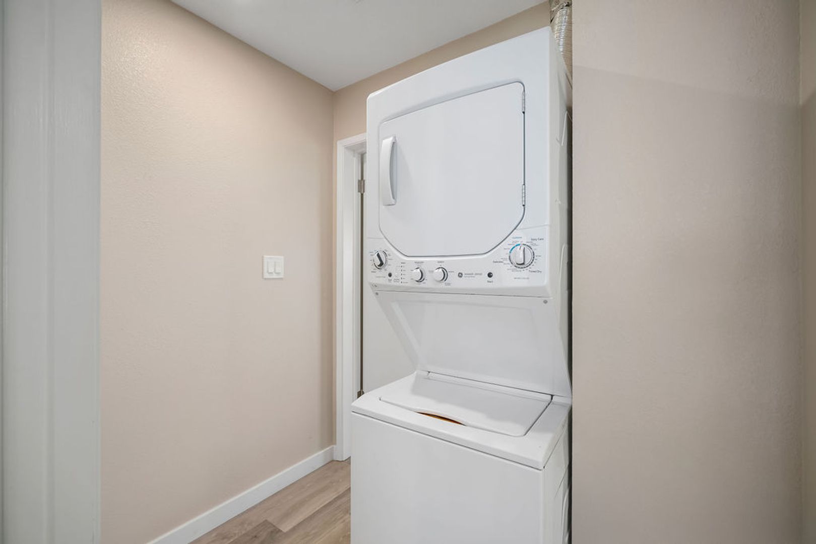 Upstairs, the primary bedroom and guest bedroom offer generous closet space and updated fixtures. The full bathroom has been modernized with a quartz vanity, new lighting, and a large walk-in glass shower. A half bath is conveniently located downstairs for guests. This unit also includes a stackable washer and dryer and ample storage throughout.